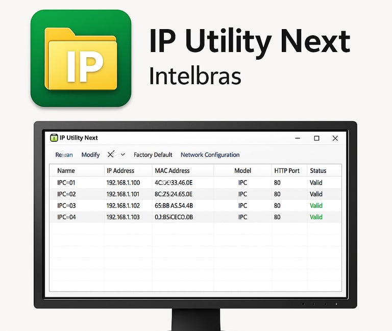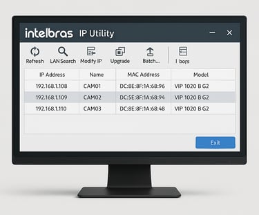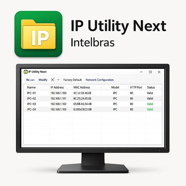 O IP Utility é o programa oficial da Intelbras para detectar e configurar dispositivos IP na rede local. Permite alterar IPs, ativar câmeras, ajustar rede e acessar parâmetros essenciais de forma ágil e organizada. Fundamental para técnicos de CFTV e instaladores que trabalham com equipamentos Intelbras.